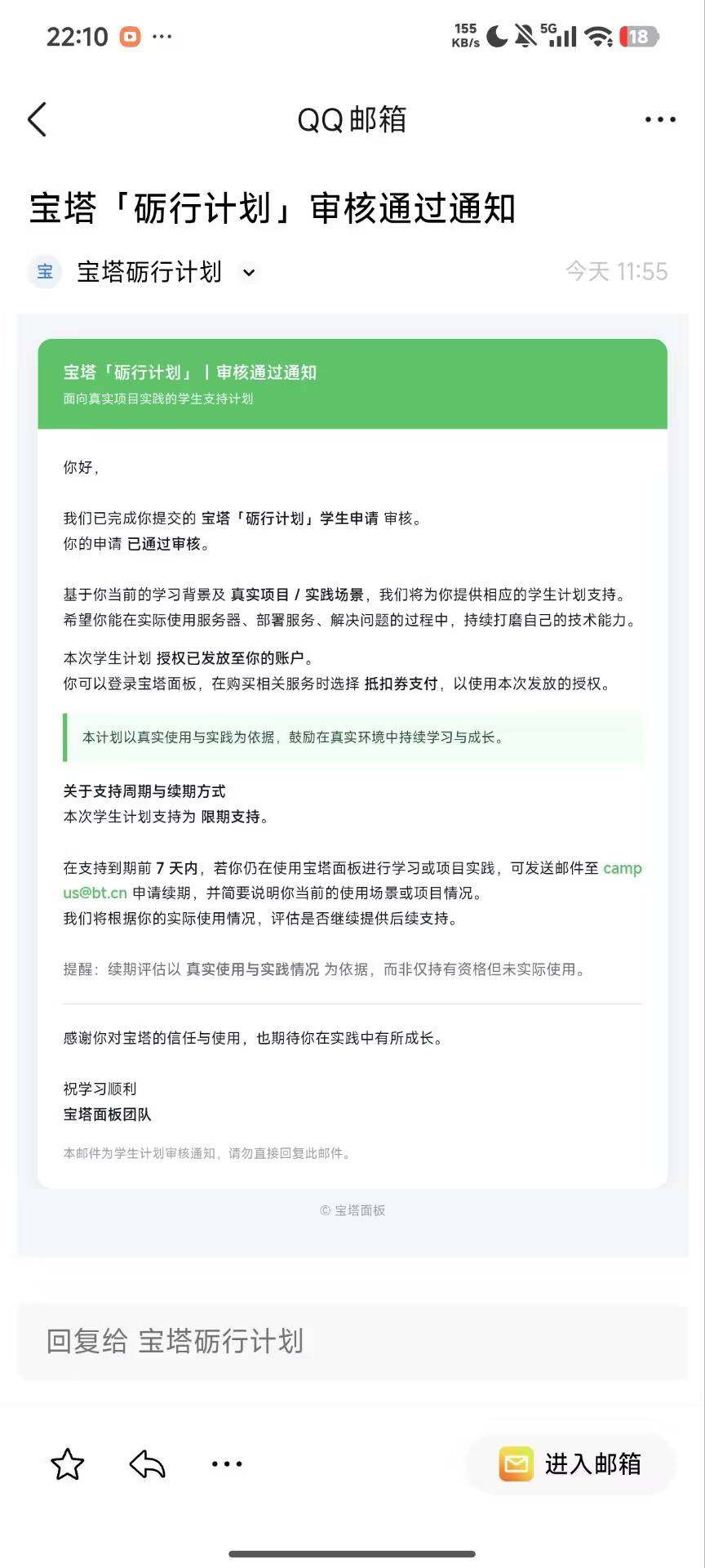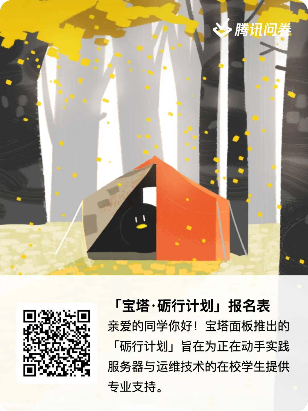 【宝塔·砺行计划】是宝塔面板官方推出的助力学生的活动 对在校的中大学生提供免费的技术服务支持 审核通过后 你可以获取宝塔面板专业版使用资格